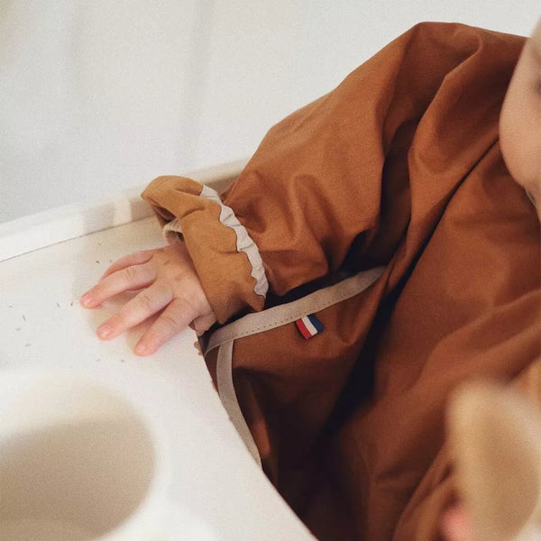 Sa large poche récupératrice à la base attrape miettes, purée ou peinture avec efficacité, rendant les apprentissages encore plus libres et joyeux. Les finitions en biais de coton ajoutent une touche délicate, tandis que sa coupe ample (75 cm d’envergure de manche à manche) assure confort et protection de 6 à 24 mois.