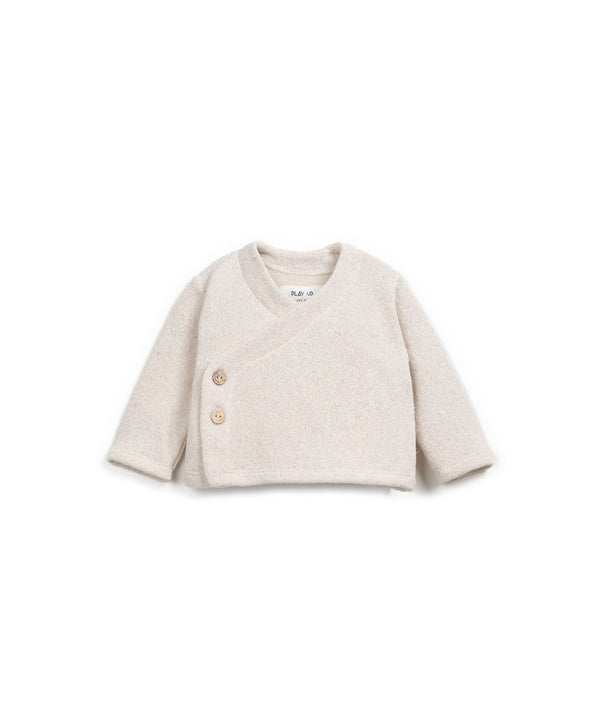 Le haut s’attache facilement grâce à son système de fermeture croisée, idéal pour les tout-petits encore sensibles aux manipulations. Le bas à pieds, lui, garde les petits orteils bien au chaud sans chaussettes qui glissent. Le tout dans une maille naturellement chinée, aux tons écrus apaisants.