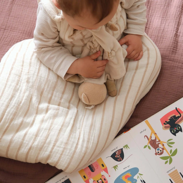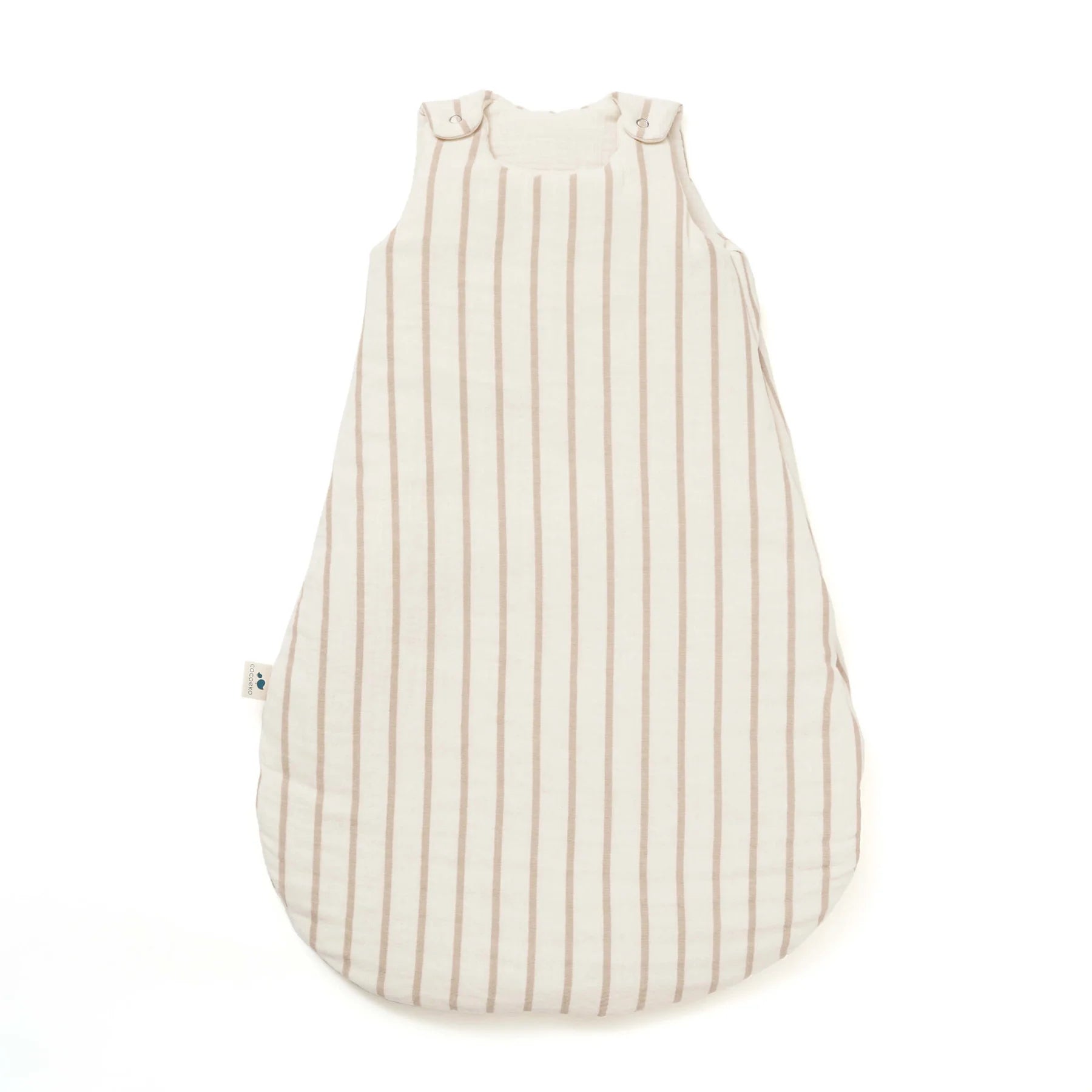 La Gigoteuse gaze de coton rayures beige TOG 2 de la marque Cocoeko est pensée pour offrir à bébé une chaleur douce et apaisée dans une chambre entre 18 °C et 22 °C.