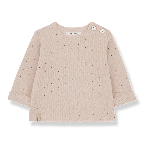 Le haut JUTTA est une pièce pleine de délicatesse, idéale pour composer les premières tenues d’automne et d’hiver. Confectionné dans une maille souple et confortable, il séduit par ses petits motifs discrets et sa teinte nude poudrée. Deux boutons à l’épaule facilitent l’habillage au quotidien, et les poignets retournés ajoutent une touche soignée. Signé 1+ in the family 🇪🇸, ce haut se porte aussi bien avec un pantalon qu’avec une jupe ou une salopette, pour un look doux et élégant.