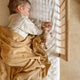Avec sa frimousse paisible et ses bois sur la tête, cette girafe invite à la tendresse. Habillée d’un damier jaune et crème , il évoque la douceur.