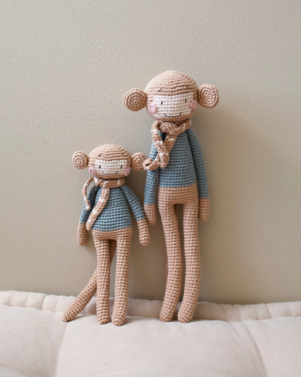 Avec son pull couleur « mer arctique » aux nuances douces et profondes, Marius le Singe invite à l’évasion et à la découverte dès les premiers mois de bébé. Conçu pour favoriser le développement cognitif, émotionnel et sensoriel, ce joli compagnon au crochet offre une texture unique qui stimule le toucher et l’exploration.