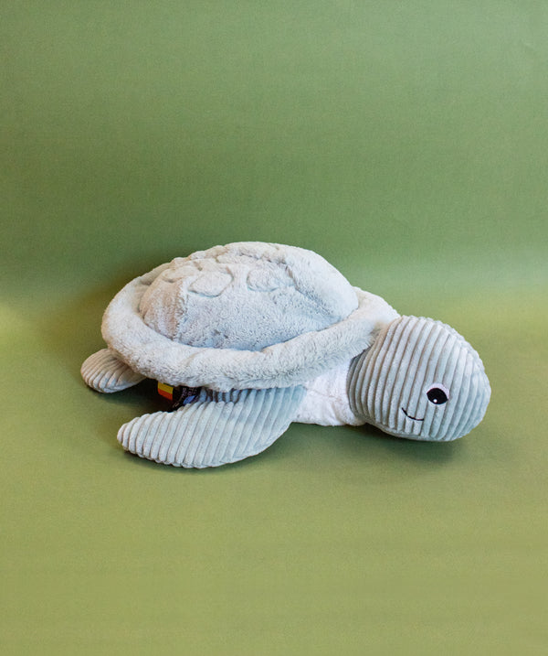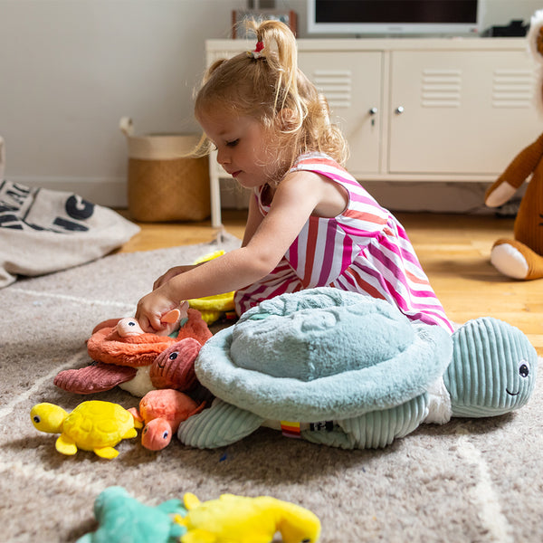 Sous sa carapace toute douce, cette adorable tortue géante couleur menthe cache un trésor : son bébé tortue, blotti contre elle, prêt pour des câlins complices. Pensée pour les petites mains, cette peluche mêle velours côtelé et pelage moelleux pour éveiller le toucher tout en rassurant. Ce joli duo fait partie de la collection Les Ptipotos, imaginée par Les Déglingos.