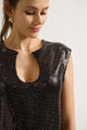 La robe Brigitte est une déclaration d’élégance pour les futures mamans. Brillante et légère, elle joue avec la lumière grâce à son tissu orné de sequins noirs, parfait pour les fêtes ou les moments où l’on souhaite simplement briller. Sa coupe droite, fluide et sans manches, épouse le corps sans le contraindre, tout en offrant un confort absolu pendant la grossesse. L’encolure goutte subtilement ouverte ajoute une touche moderne et féminine.