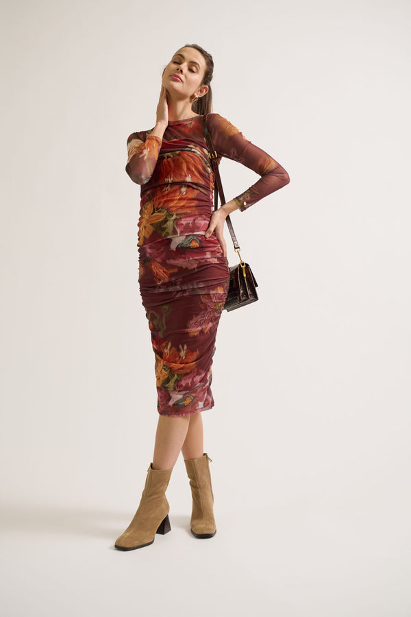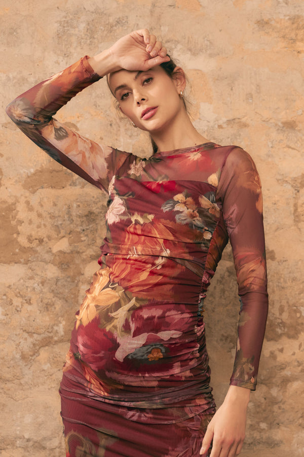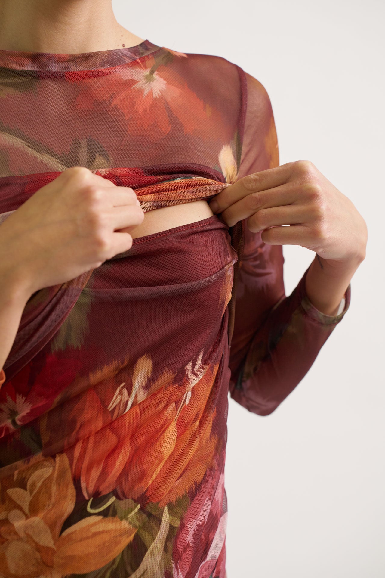 Cette robe Vanessa près du corps à imprimé fleuri est confectionnée en tulle stretch et doublée de lyocell, une matière souple et légère qui épouse les formes sans comprimer. Des fronces latérales soulignent élégamment le ventre qui s’arrondit, tandis qu’un accès allaitement discret sous la poitrine, manipulable d’une seule main, la rend pratique au quotidien. Sa coupe ajustée permet de la porter avant, pendant et après la grossesse.