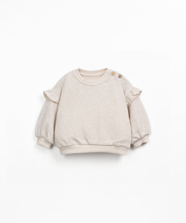 Ce sweatshirt en coton recyclé au coloris écru est une invitation à la tendresse. On craque pour ses jolis volants sur les épaules et ses boutons en bois, qui ajoutent une touche vintage à cette pièce résolument confortable.